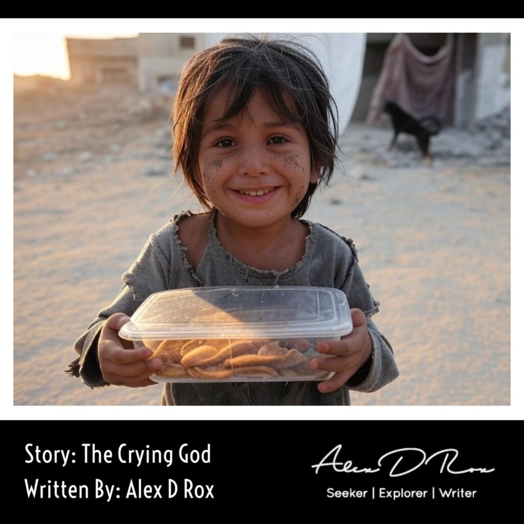 The Crying God Suddenly, I noticed a kid bit far from me, standing still. I walked toward and saw the kid was crying. The kid was alone and no one else was there, I looked around. I noticed the kid was wearing very old and dirty clothes, which were also ripped, hair was messy full of dust and dried tears had mixed with the dust on the cheeks. The kid hadn’t taken a shower in many days or maybe even weeks, I assumed. And how could the kid have taken a shower by own? As the kid was probably just 4 or 5 years old. Maybe no one was taking care of the kid or maybe there was no one left in kid’s life to care. I went close, gently comforted the child and asked, “Why are you crying?” The child looked at me and said something I couldn’t understand, it was Arabic. Then I tried to ask with hand gestures and by nodding my head. The child kept crying, saying something that I still couldn’t understand. I was getting desperate to do something to calm the kid. And I thought about offering the food I had packed that morning before heading out to visit that “Warzone in Gaza”. I wiped the child’s tears, took out the food box and extended it toward the child. The moment child saw the food packed in the transparent plastic box, not only did the crying stop but a smile appeared too. That smile on the kid’s lips and the tears in my eyes came together. But I held myself back and gently handed over the box. The kid grabbed the food with both tiny hands and started running, running with joy and excitement without saying a word to me. And I didn’t want to hear “thank you” either. All I wanted was to stop those tears and I had done that. That was everything to me. But something made me curious, the kid didn’t open the box and didn’t eat the food but ran away. So many questions popped into my head: Why and where did the kid run away?Why did the kid stop crying and start smiling just by seeing the food but did not eat it?Where did the sudden joy come from?Wasn’t the kid really hungry?What was the kid trying to say in Arabic? To find the answers, I decided to follow the kid. I walked in the direction the child had run. I didn’t see anyone at first, so I kept going. After walking around 200 meters, I saw a broken house, probably destroyed by bombings, I assumed. In front of it, a very skinny dog was frolicking near an old and torn curtain. I moved nearer because I could hear some faint sounds coming from behind the curtain. I slightly moved the curtain aside, tilted my neck to the left and peered inside. Oh my God! What I saw… I couldn’t control myself this time, I broke down. I started crying like I had just seen something beyond human understanding. That 4–5 years s old child was feeding that food to small puppies and happily sharing it with them, maybe none of them had eaten in days. I had never seen that much love and care for someone before. I fell to my knees and cried uncontrollably. Then the baby looked at me, came closer and said something in Arabic again. But I understood what the child meant: kid was asking why I was crying. I replied in English, “You’re a great soul or maybe you’re God in a human body.” The kid didn’t understand my words but wiped my tears and extended the same food box toward me with both of tiny hand and care in eyes. Ohh… it touched my soul and my heart just melted. I nodded my head, as I didn’t want any food. That child had already fed my soul. As I was still crying, the child came closer and hugged me, so tightly. And that was the moment I felt as if the whole of humanity, the universe and God itself had gripped me with immense love. ~ Alex D Rox